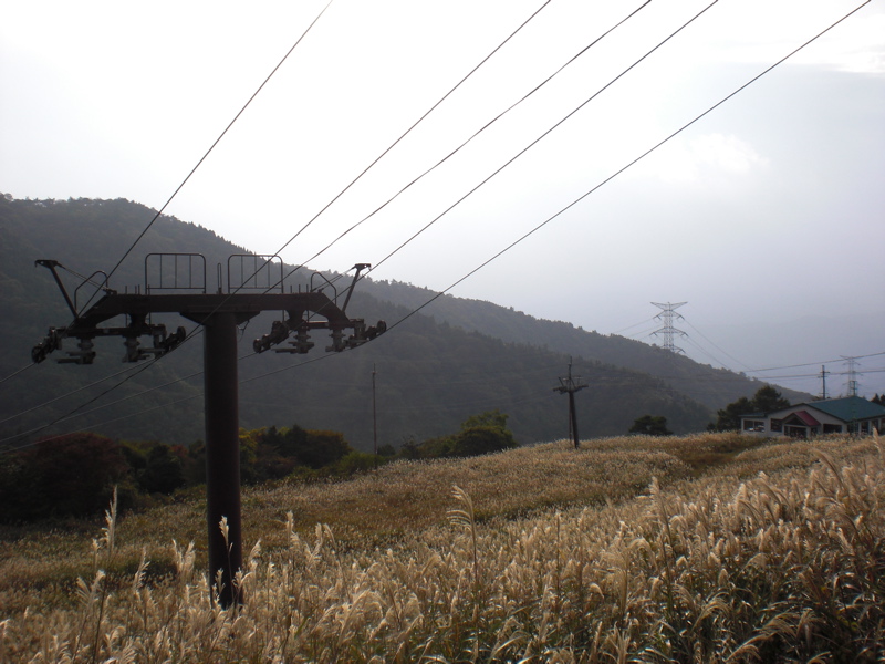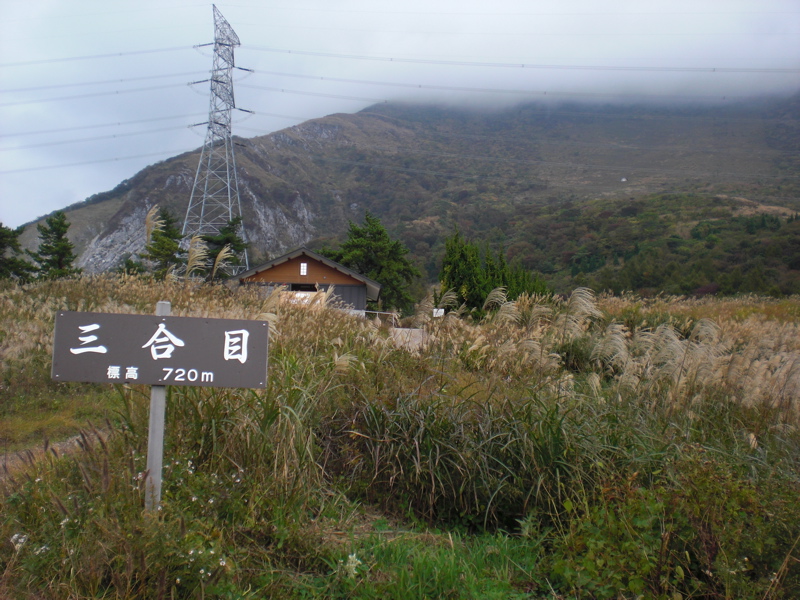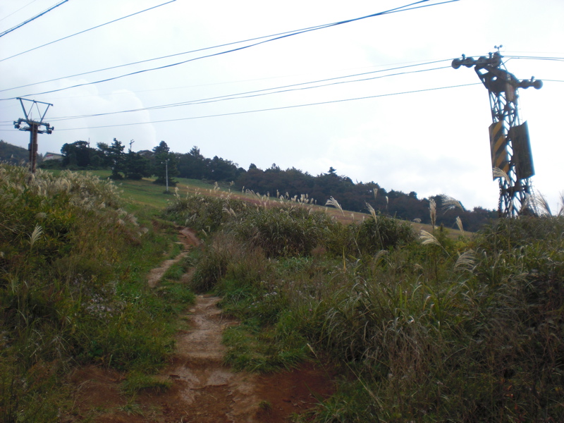 8:20三合目付近。勾配も緩やかになりあたりはすすき一色。現在は運行休止だがゴンドラでここまでショートカットもできる。視界が開けて伊吹山の全容がようやく望めたが山頂は横一線きれいにガスの中。(晴れてくれー)