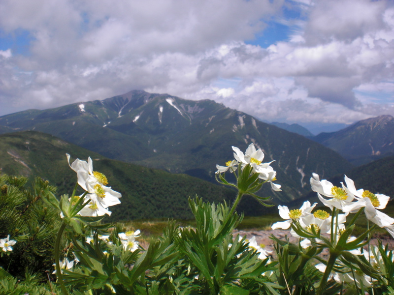 急登を登りきった北ノ俣岳の肩にはハクサンイチゲのお花畑。