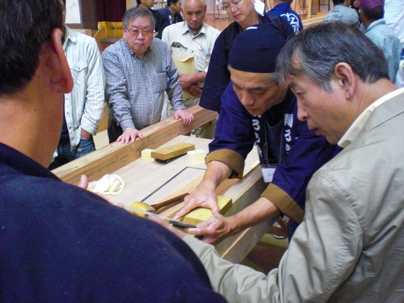 さぁいよいよ2日目、大将の大鉋パフォーマンス。平然とひいてますが相当抵抗が強いらしい。てか鉋身どーやって研いでんすか?何か腱鞘炎なっちゃいそう。これだけ幅広の板目材だと反りの力もハンパ無いので補強のサネが必要みたいです。大鉋の重量も相当、スケールがちゃいます。