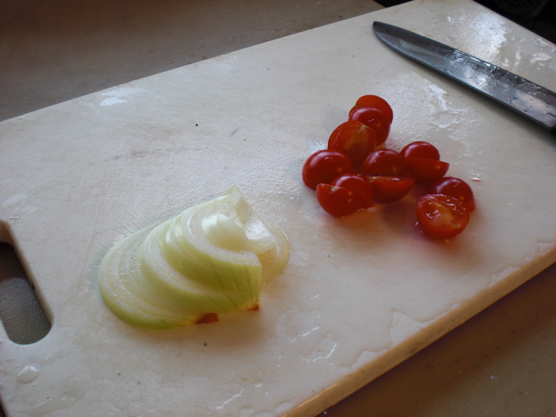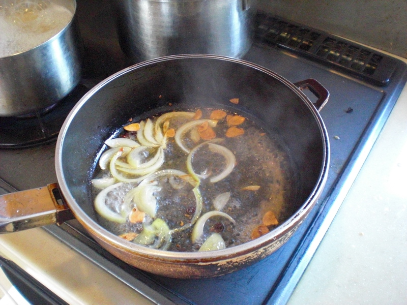 タマネギ、鷹の爪は千切り。ニンニクは芯をとってみじん切り。