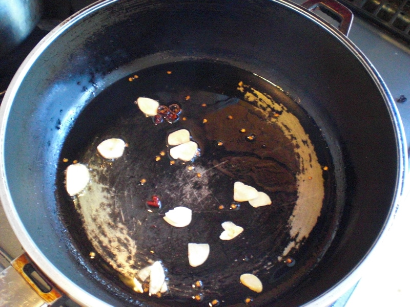 フライパンにオリーブオイルをひき先程のニンニク、鷹の爪をいれ香りをつけます。(今回はスライスにんにくを使いました)