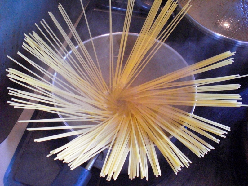 沸騰しているお湯にパスタをいれます。湯で時間は表示時間ー1分ぐらいが目安。