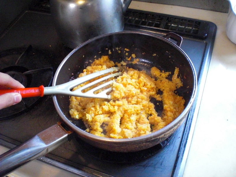 フライパンにオリーブオイルをしきタマネギを炒めます。