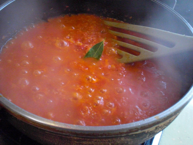 火が通ったらホールトマトを加えます。トマトの塊は潰してしまおう!
