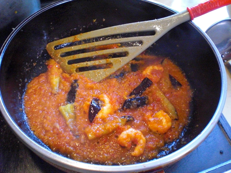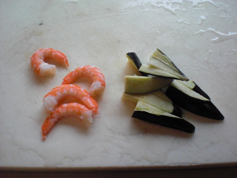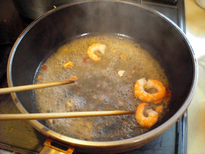 新たにフライパンにオリーブオイルをひいてにんにく、鷹の爪、エビを加えます。