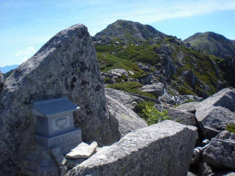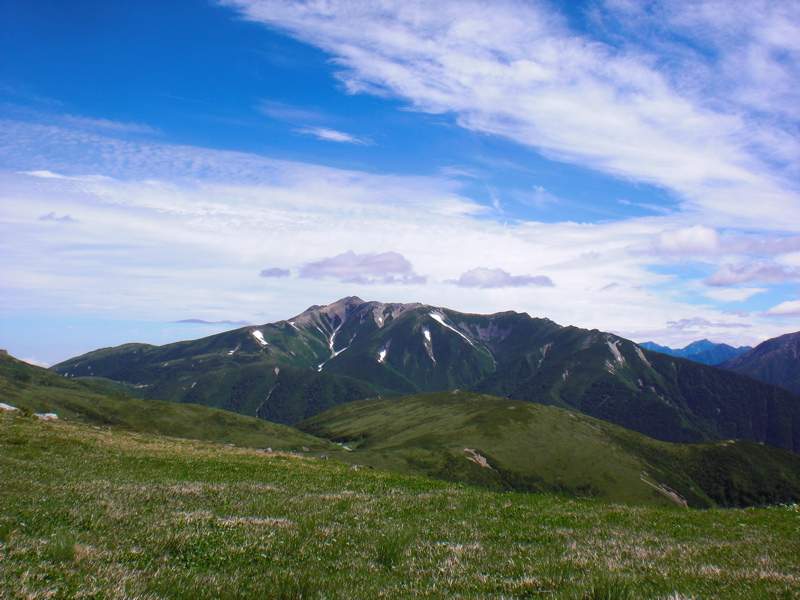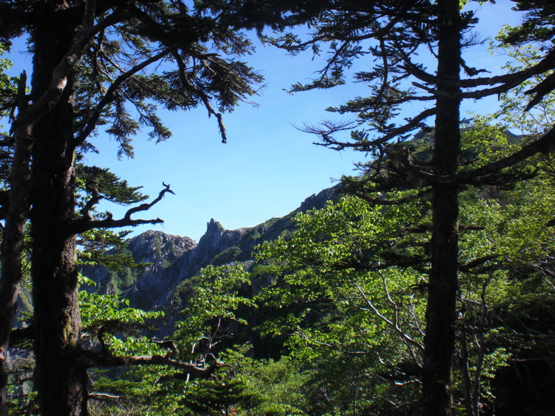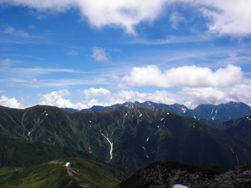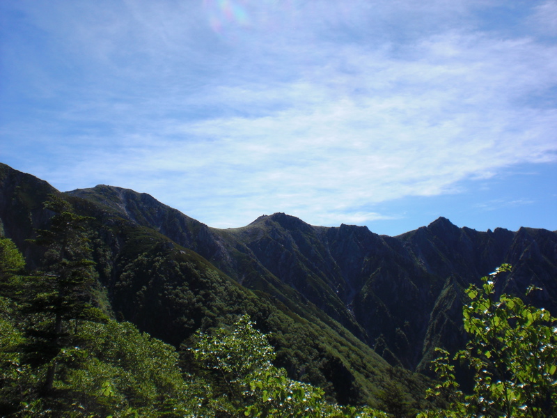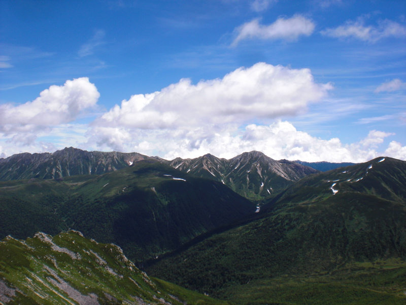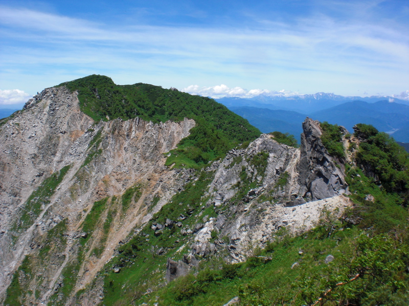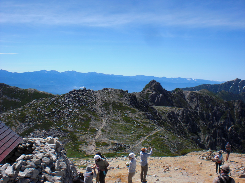 東方向。尾根沿いに中岳、宝剣岳、さらに右に三ノ沢岳。