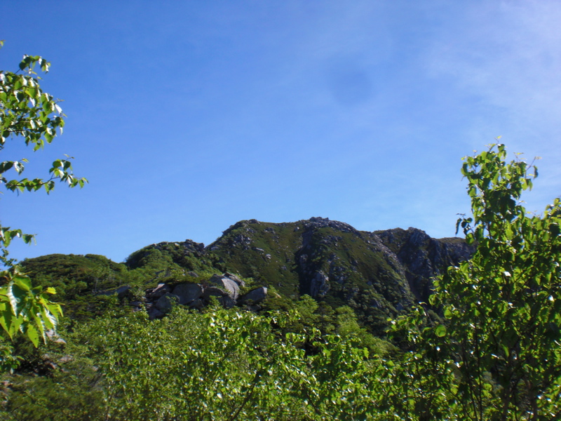 向かって左の尾根道に牙岩がみえる。尖った鋭い岩の塊だ。