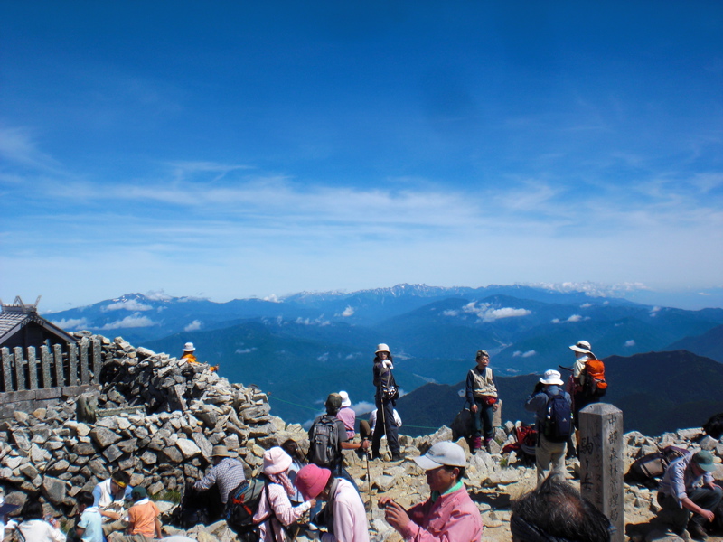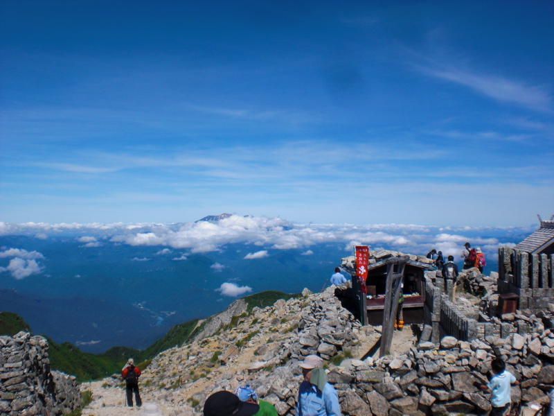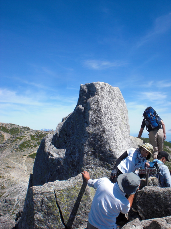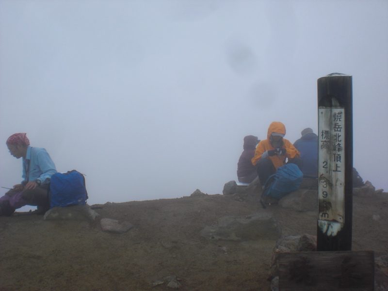 ガスっていてもやはり北アルプス、頂上も登山客で賑わしい。