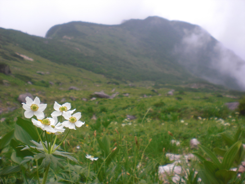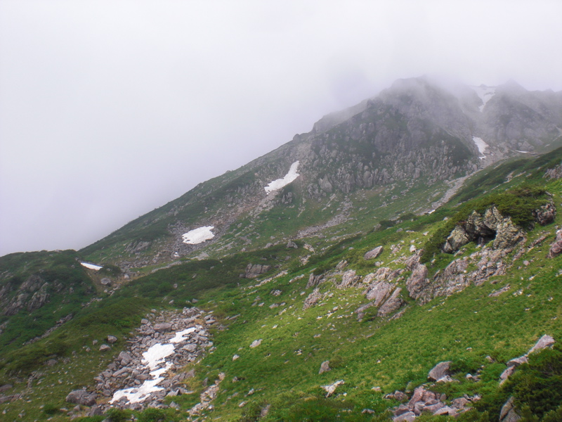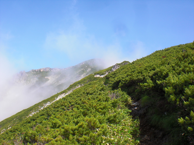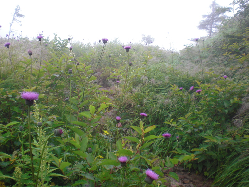 ガスが遮ってますがここらは樹林帯を抜け高山植物が自生している。