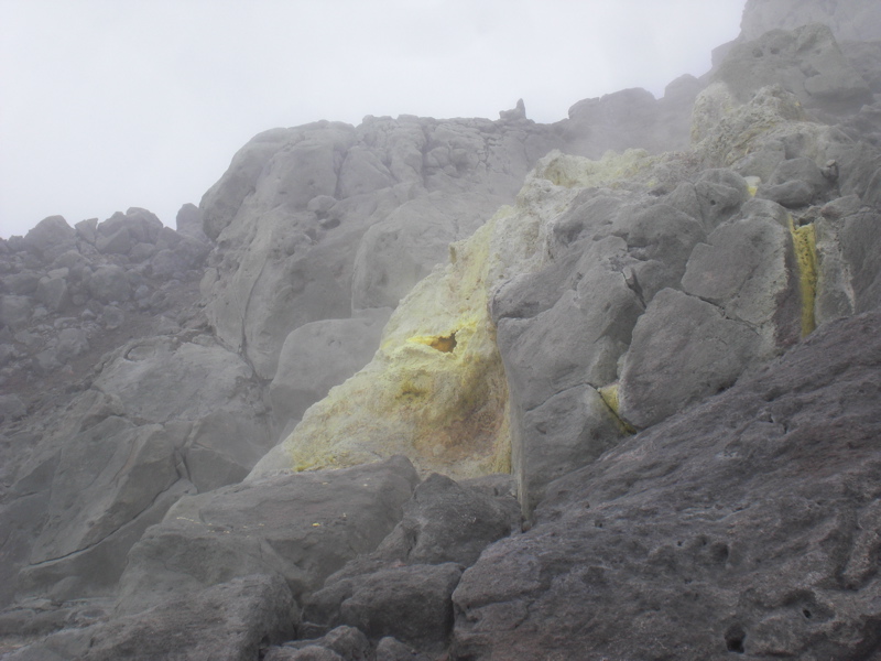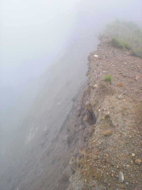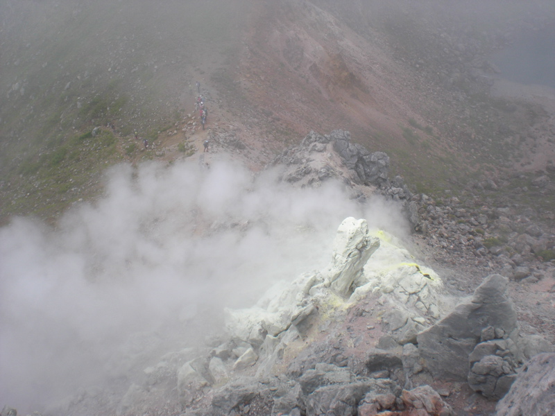 水場を過ぎると勾配がきつくなりガスも濃く漂いはじめる。