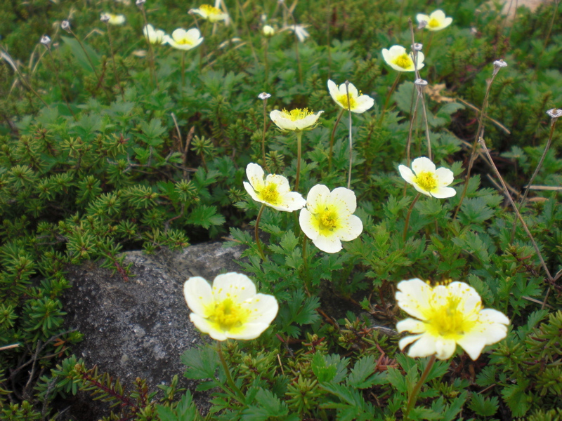 左上からチングルマ、シナノキンバイ、ハクサンフウロ、シモツケソウ、オオバギボウシ。