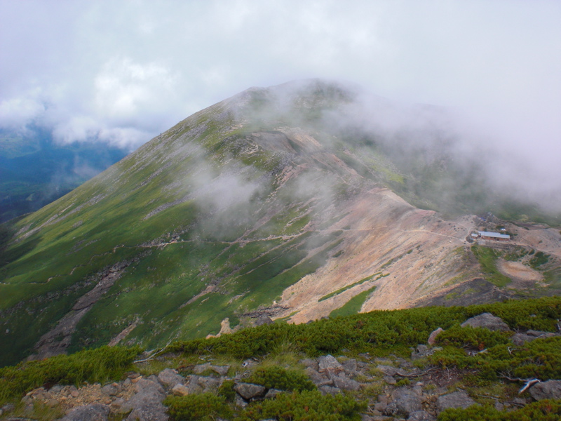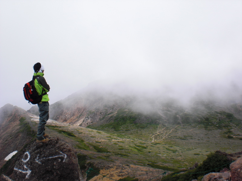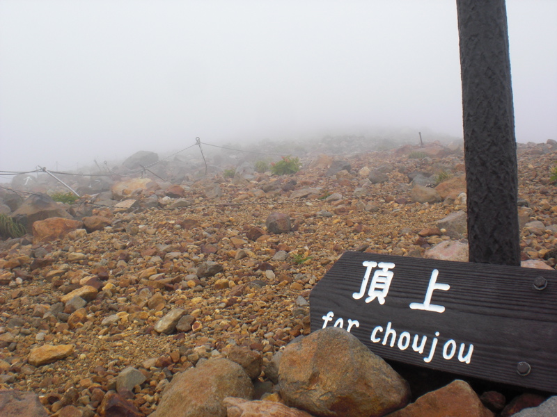 風もそうですがガスも曲者。目的地・現在地がわからないというのはそうとう精神にこたえます。山頂目前の二ノ池もみえません。苦行になりつつある現状。(涙)