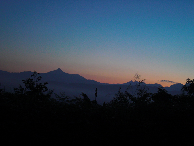AM5:00。夜明け前、穂高のシルエットが素敵っす。登山道入り口は岐阜県側の青少年交流の家から。準備やらなんやらで5:30登山開始!もう戻れません。