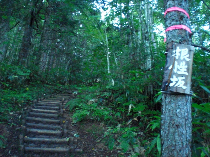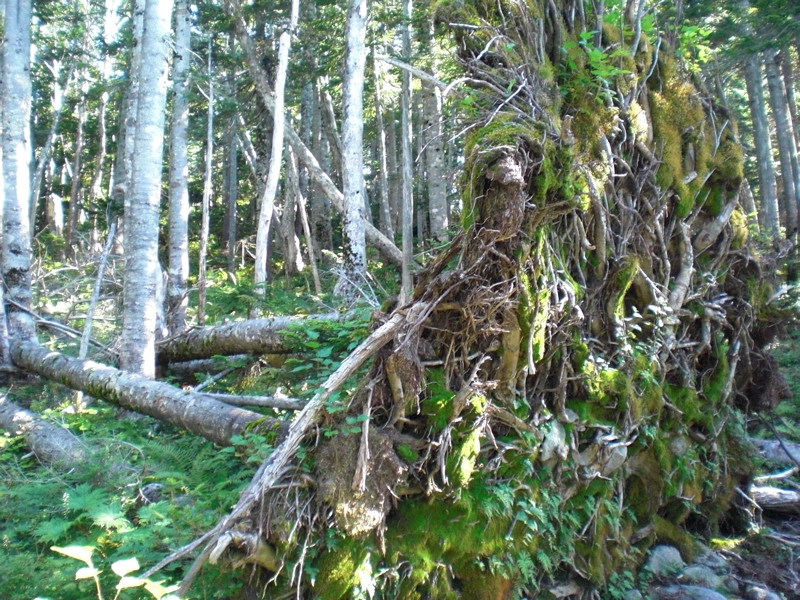 中間付近。ここまでの道がオニ。道を朝露を含んだ熊笹が覆い尽くし下半身・靴のなかまでびしょびしょ。道もわからんし、地面からボルトの先端が突き出てる箇所も多数。廃れてます。根っこからの倒木もあちこち、不気味な光景こえーよ。