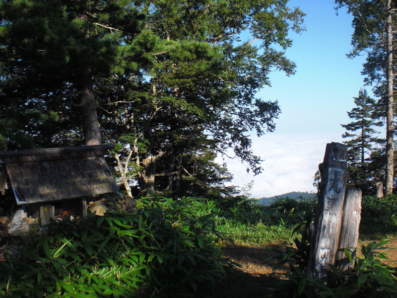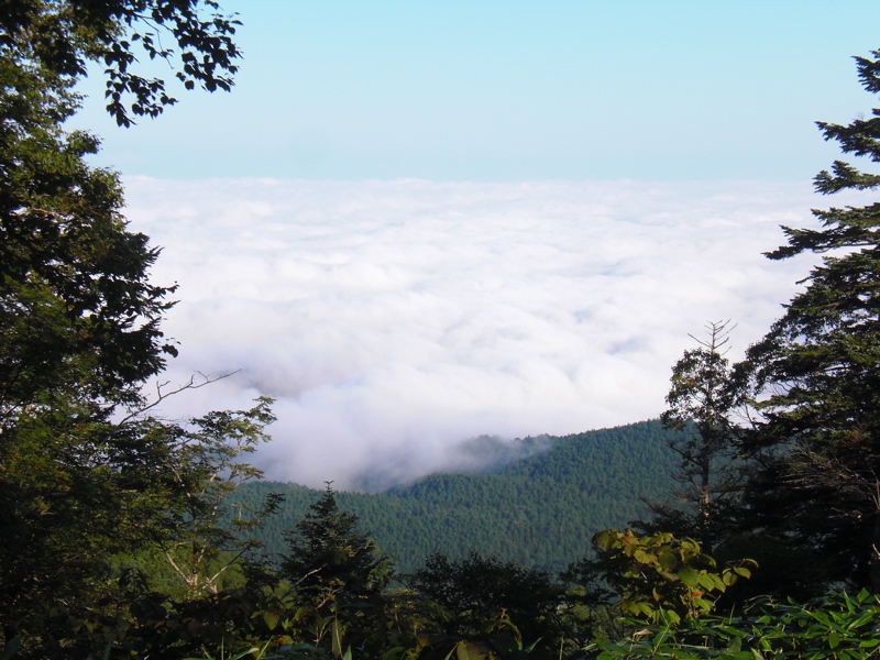 7:30丸黒山山頂1956M。たいして登ってないが尾根道なのでアップダウンが激しい。道がいいのはここまでらしい。下界は雲の中だ、ひゃっほーい。