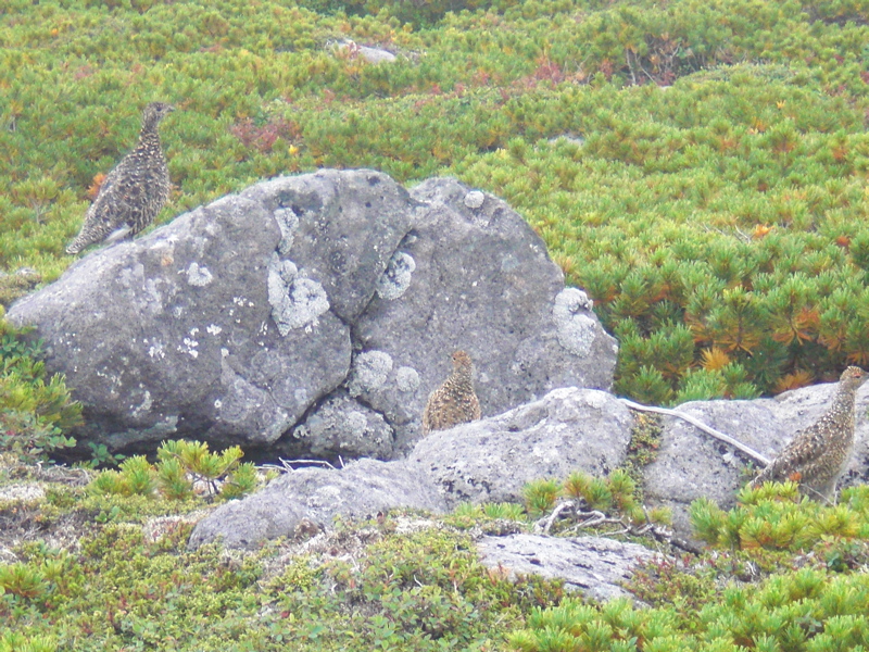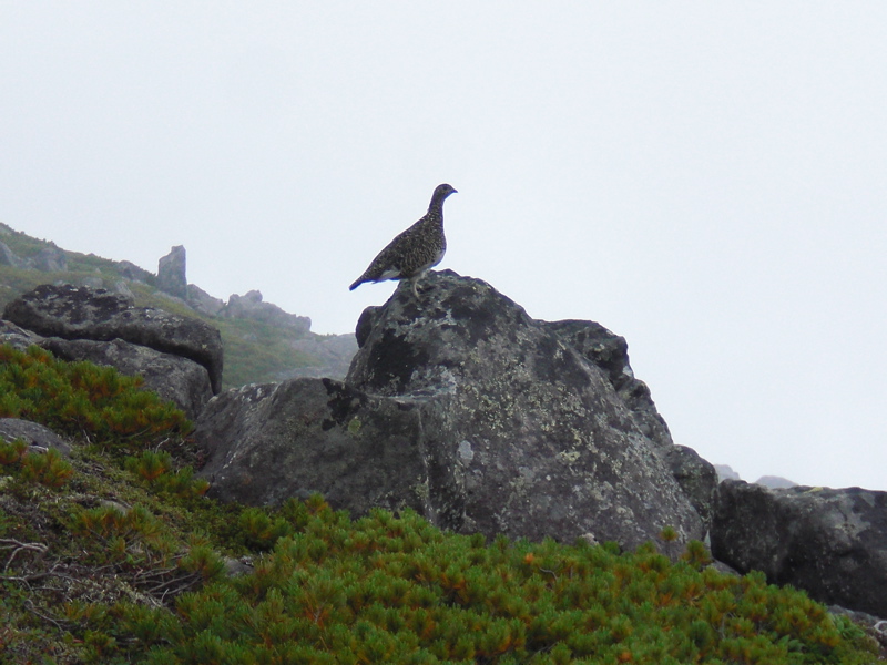 小さな幸せ。特別天然記念物の雷鳥と遭遇。3000M級の高山にしか生息せず乗鞍には100羽程しかいないらしい。なんとそこには5羽もいて5Mぐらい近寄っても逃げない。(おらー喰っちまうぞー)飛ぶのも得意では無いみたいで、終止ぴょこぴょこ歩き回ってた。かわゆい。近くのハイマツの中から雛の鳴き声も聞こえていい思い出になったで〜。