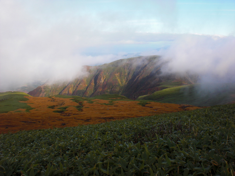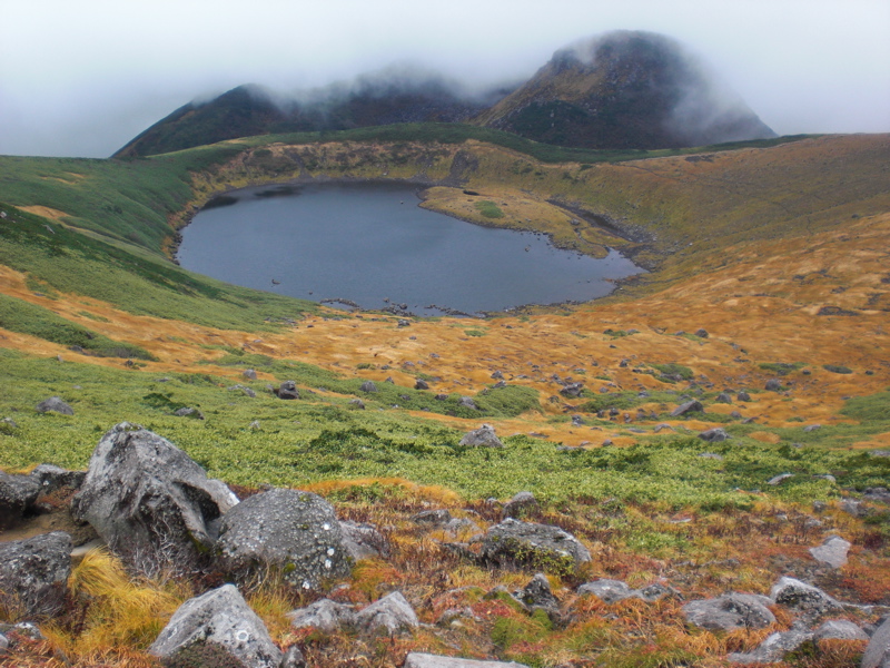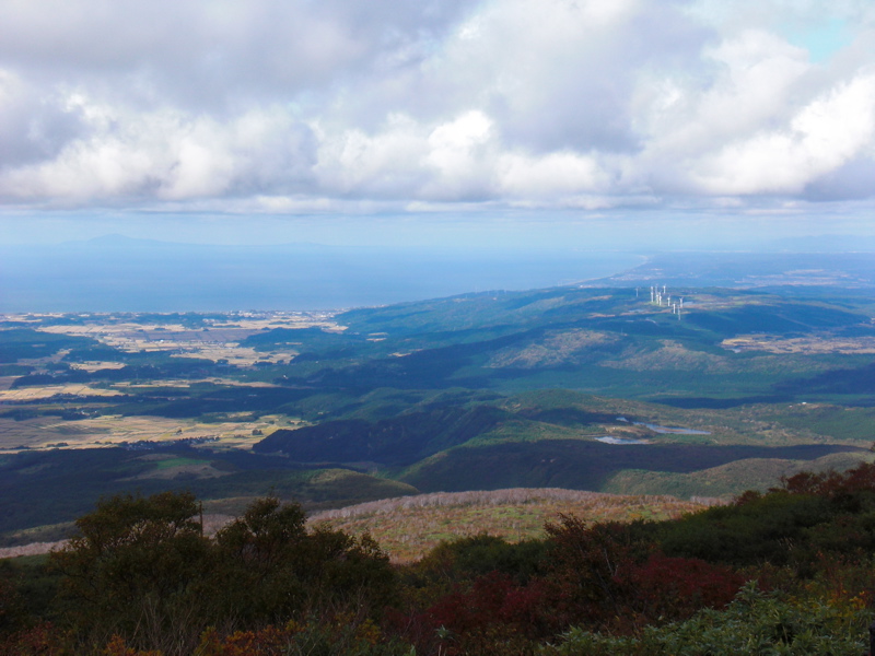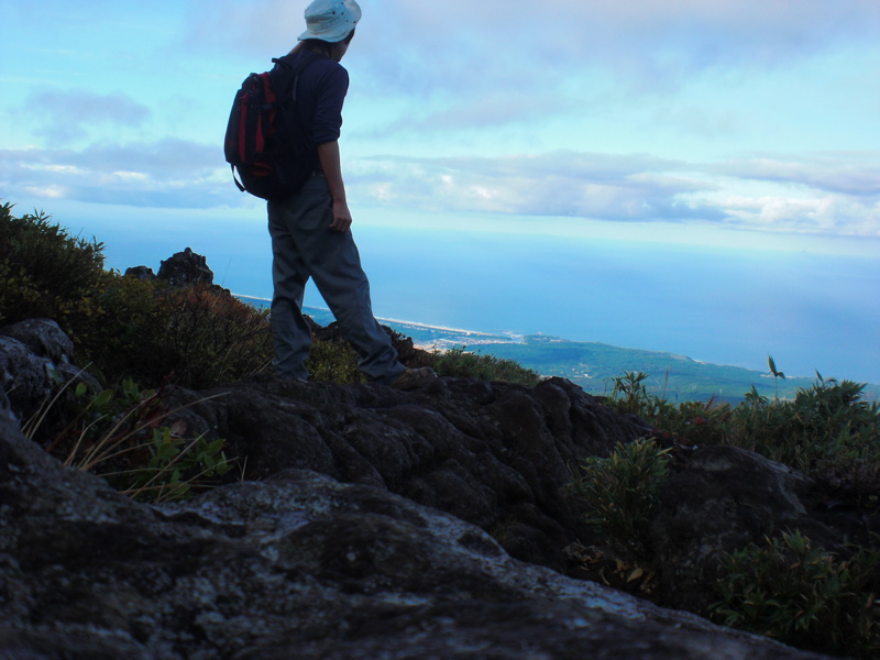 振り返るとそこには開けた日本海。岐阜中心の山々を登ってる自分としてはすごく新鮮な登山になりそうです。鳥海湖(別名鳥ノ海)は欠けた月の様な奇麗な形。途中出会った地元の登山客が「おとつい鳥海山で初雪が降ったんだ」と教えてくれた。(流石は東北だ、山頂は寒そうだな〜)と、このときまだ自分は鳥海山を甘くみていました・・・。