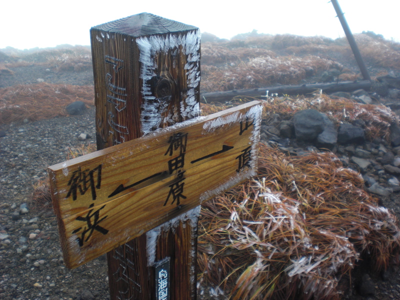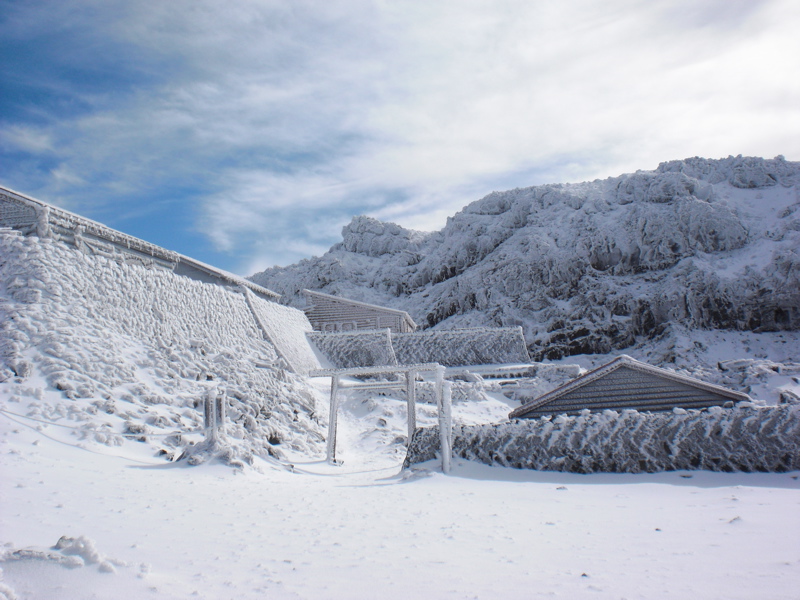 はい、でました山頂付近の大物忌神社。もう初雪とかカワイイもんじゃ無い。標識・目印も雪かぶって見つからない、うっすら浮かぶ足跡が頼りです。テンション上がるけどノーマル装備ではそろそろ不安が・・・。