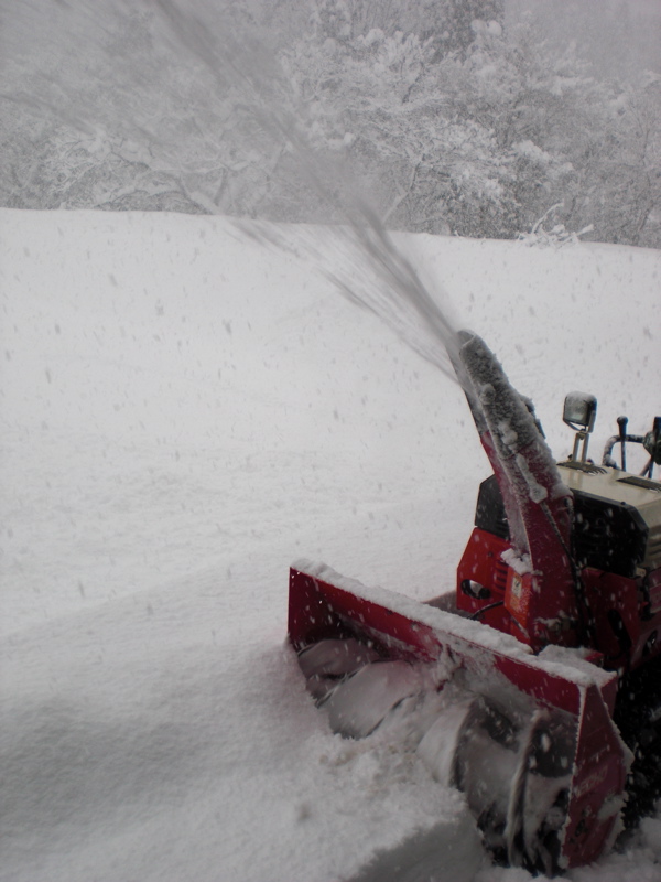 ここで秘蔵っ子除雪機の登場。じいちゃんがブイブイいわせているの図。雪国ではかなり重宝するよ!楽ちん!でも万能とまでもいかない。雪が湿っているとすぐ詰まってしまうから逆に使いづらくなるんです。