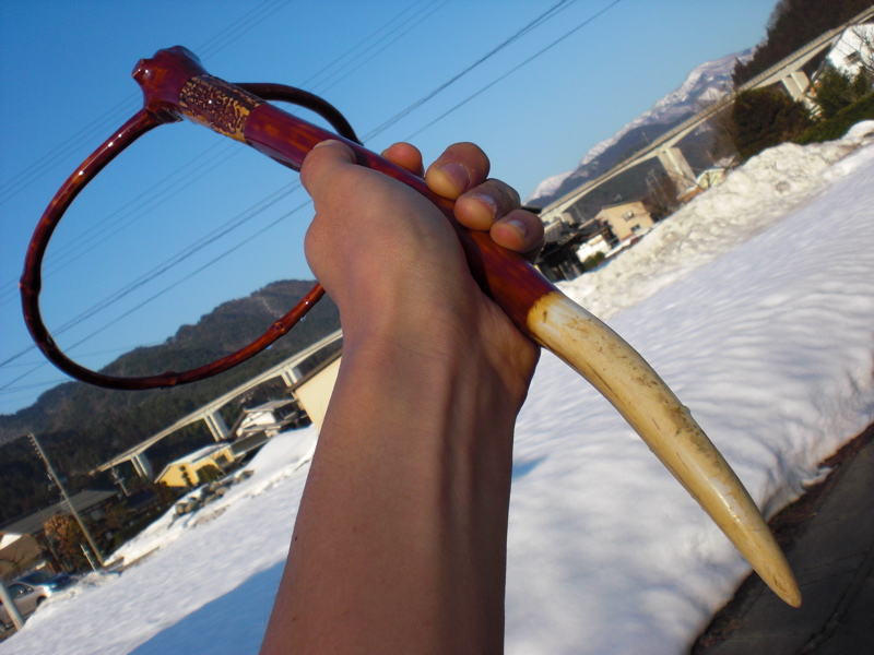 なんとなんとお手製、鹿の角を曲げて作ったタモであります。